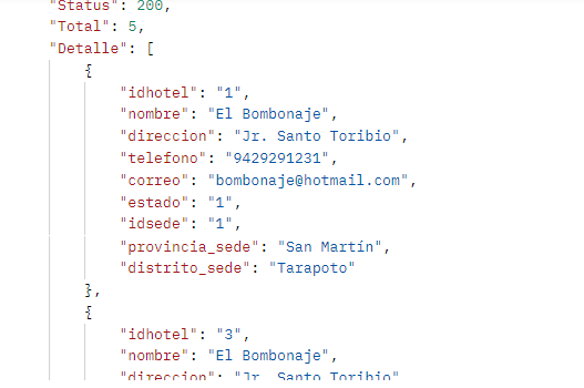 El resultado de la consulta de todas los Hoteles debería ser como se muestra en la siguiente imagen: