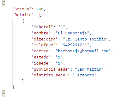 El resultado de la consulta de un hotel en particular debería ser como se muestra en la siguiente imagen: