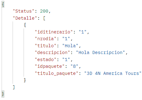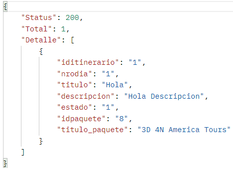 El resultado de la consulta de todos los itinerarios debería ser como se muestra en la siguiente imagen: