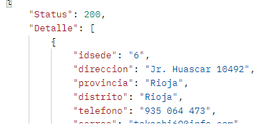 El resultado de la consulta de todas los sedes debería ser como se muestra en la siguiente imagen: